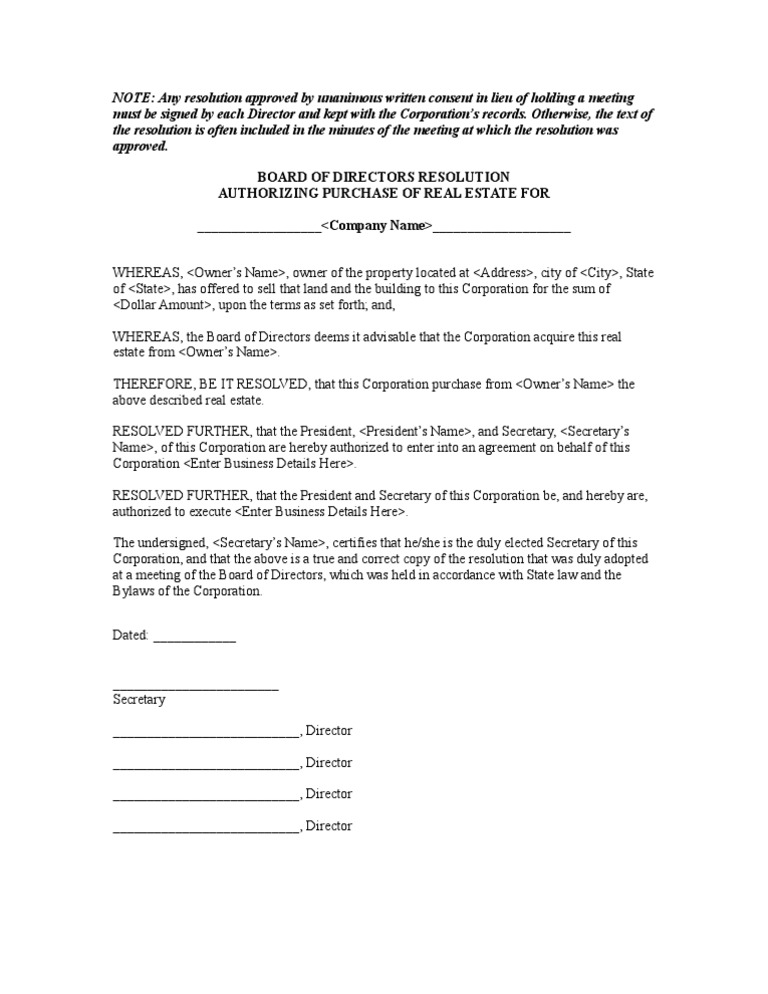 Resolution Authorizing Purchase Of Real Estate Board Of Directors Virtue