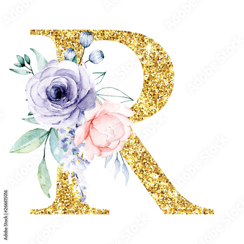 Floral Alphabet Letter R With Watercolor Flowers And Leaf Gold Glitter Monogram Initials Perfectly For Wedding Invitation Greeting Card Logo And Other Holiday Design Hand Drawn Stock Illustration Adobe Stock