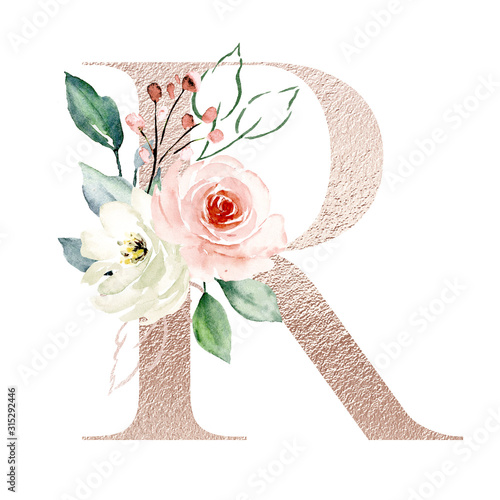 Letter R Gold Alphabet Letters With Watercolor Flowers Roses And Leaf Floral Monogram Initials Perfectly For Wedding Invitation Greeting Card Logo Poster And Other Holiday Design Hand Painting Stock Illustration Adobe
