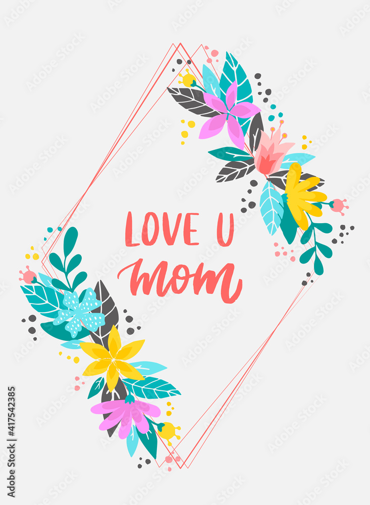 Cute Hand Lettering Quote Love You Mom Decorated With Abstract Flowers And Leaves For Greeting Cards Posters Prints Invitations Etc Wall Mural Natali Osipova